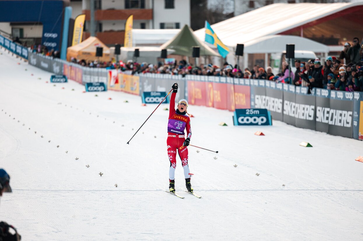 In the women’s race Therese Johaug stood out: the Norwegian champion made ‘stage and jersey’ and with her success over Teresa Stadlober (2nd) and Astrid Oeyre Slind (3rd) took the overall ranking lead. Johaug made the winning attack at the end of the 4th lap, the first of the skating laps after the first three laps in classic technique. The podium was decided in a sprint to the photo finish that handed the ‘wooden medal’ to a rediscovered Ebba Andersson.