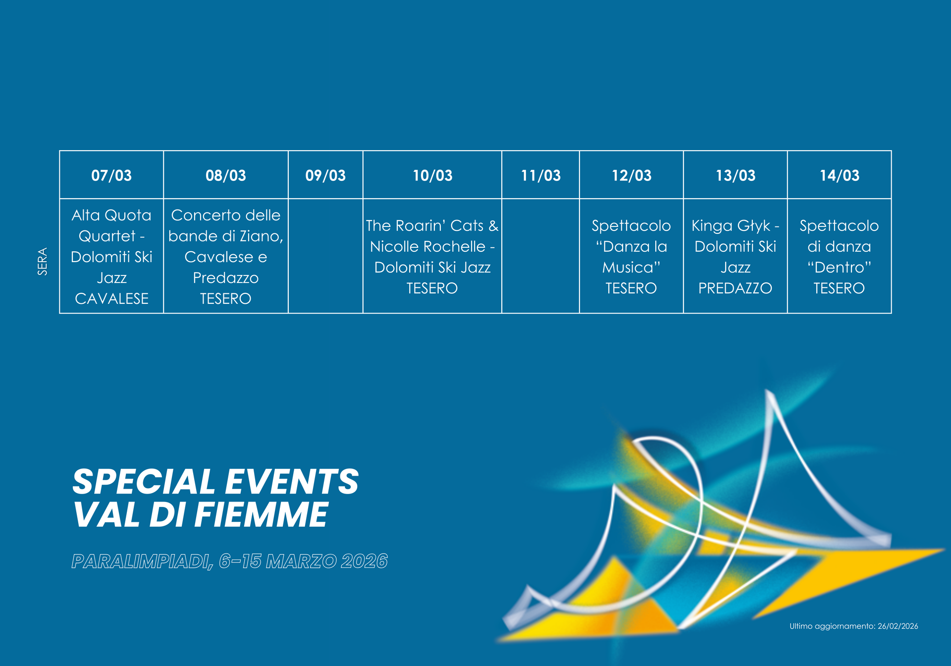 In occasione dei Giochi Paralimpici invernali di Milano Cortina 2026, la Val di Fiemme si prepara a trasformarsi in un grande palcoscenico di cultura, tradizione e divertimento. Un programma ricco di eventi diffusi animerà la valle, invitando residenti e visitatori a vivere l’energia unica dei Giochi attraverso spettacoli, mostre e performance artistiche.